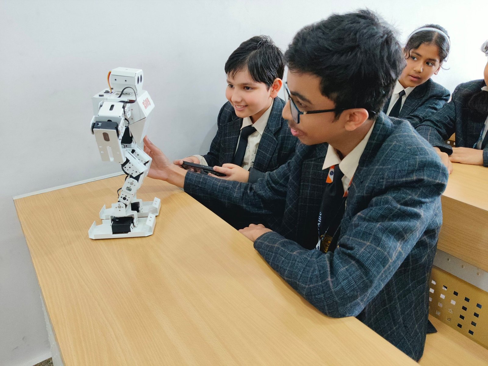 Students work with pre-built and modular robots to understand the basics of robotics and programming. They explore projects like programmable robots, robotic arms, gesture and voice-controlled robots, maze-solving robots, bipedal and hexapod robots, autonomous delivery robots, drones, RC planes, and humanoid robots, gaining hands-on experience with real-world robotic technologies.